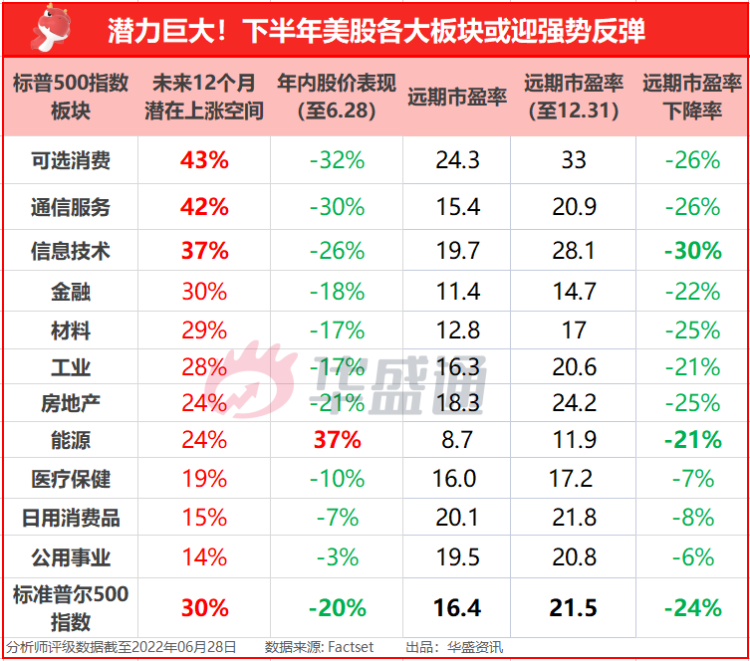 下半年美股交易方向如何呢?FactSet调查华尔街分析师对标普500指数各个板块个爱股的看法,其中消费板块最受华尔街看好,预计未来12个月潜在上涨空间达43%。此外,各个板块中华尔街分析师最爱哪些个股?一起来看看吧!