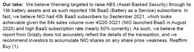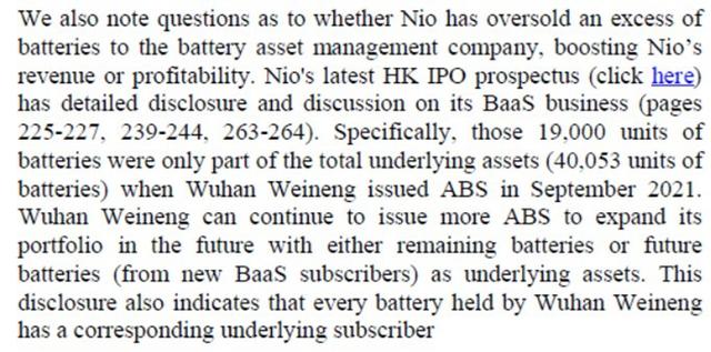 Grizzly Research的做空报告指出,截至2021年9月,蔚来与蔚能通过关联交易形式,出售了4万块电池,而根据蔚能ABN募集说明书,其用于ABN的BaaS订单数为19,000,由此认为蔚来向蔚能过度销售电池,从而夸大自身营业收入和净利润。