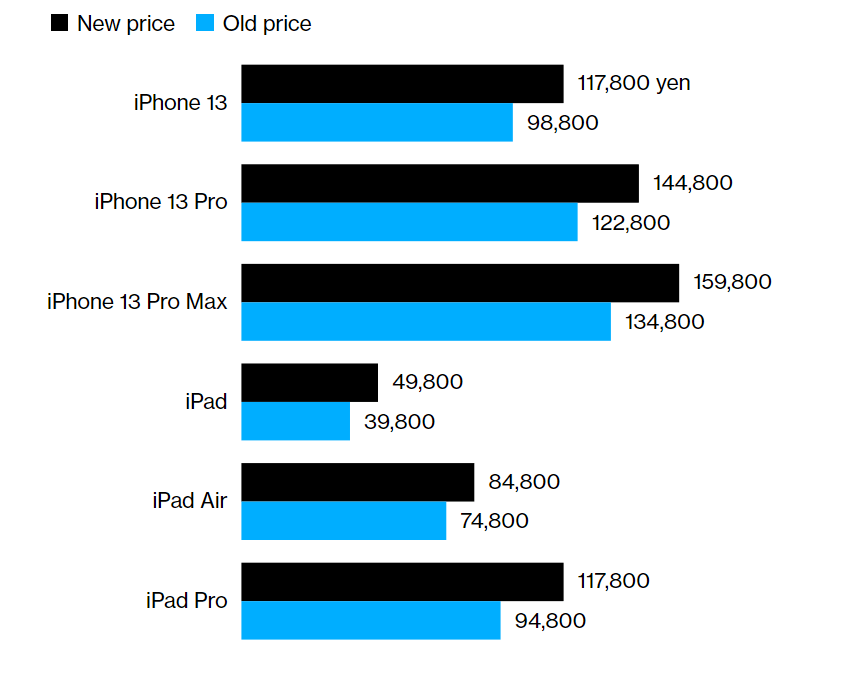 5、苹果产品在日本全面涨价,iPhone13涨19%