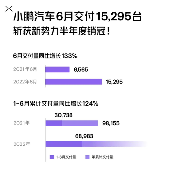 小鹏汽车:6月总交付15295台,同比增长133%