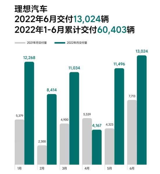 理想汽车今日公布2022年6月交付数据。2022年6月,理想汽车交付13024辆理想ONE,同比2021年6月增长68.9%。第二季度累计交付28687辆,同比2021年第二季度增长63.2%。