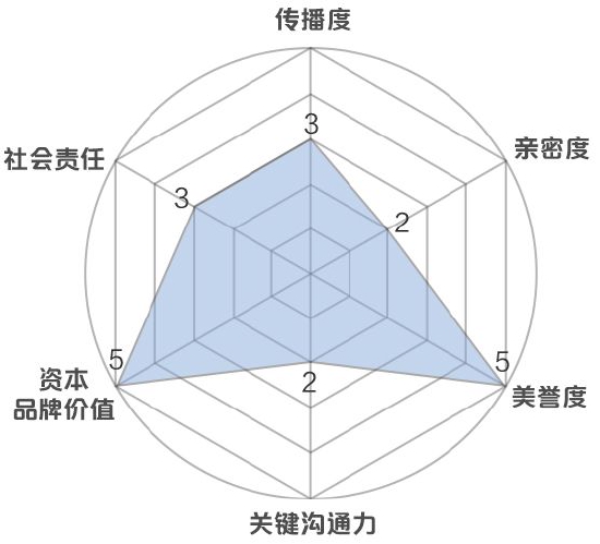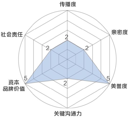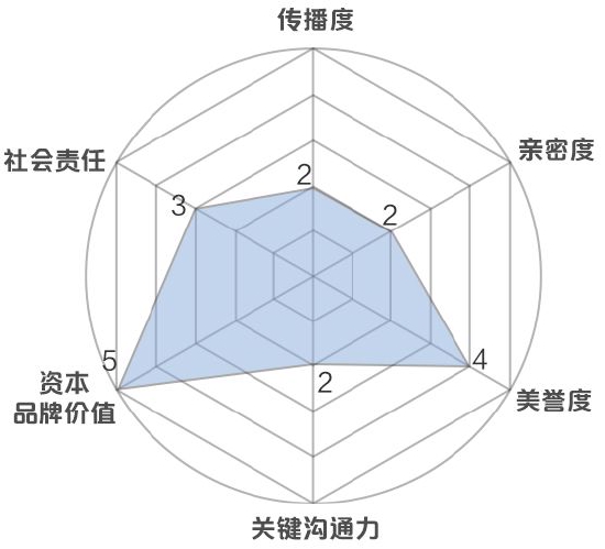 新浪财经品牌价值模型:传播度2分,亲密度3分,美誉度4分,关键沟通力2分,资本品牌价值5分,社会责任2分