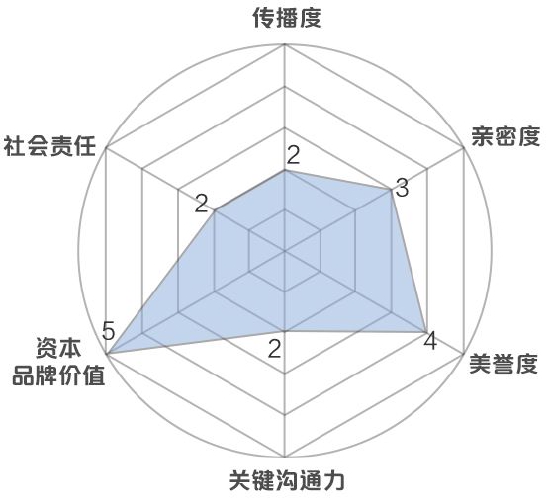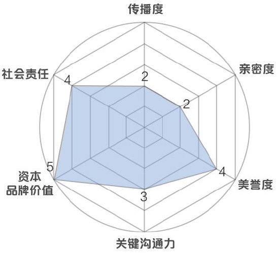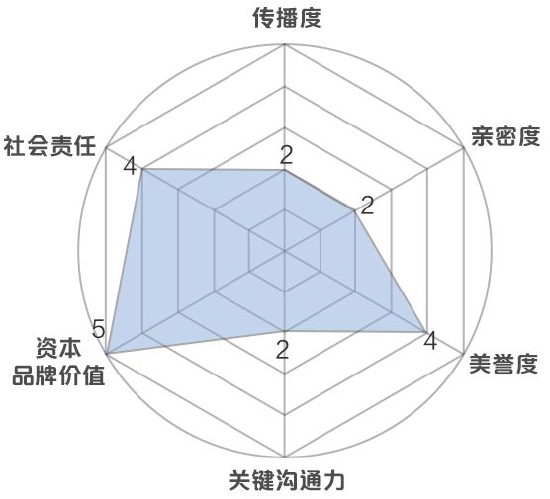 新浪财经品牌价值模型:传播度2分,亲密度2分,美誉度4分,关键沟通力3分,资本品牌价值5分,社会责任4分