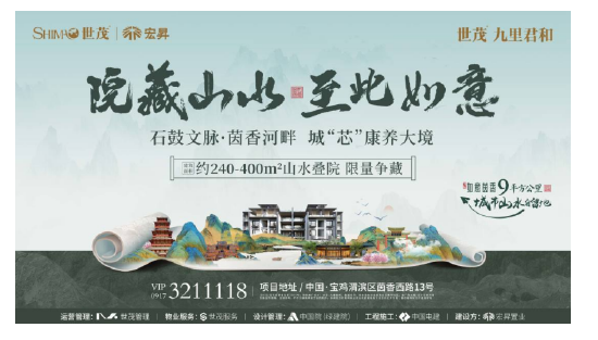 世茂管理与宏昇领衔,联合中国建筑设计研究院有限公司、中国水利水电第十一工程局有限公司,承茵香河一脉风景,溯源千年宝鸡康养文化,通过对山水特色的写意提炼,以精巧的建筑语言,将自然、生活与建筑结合起来。两家品质央企加入,无疑为世茂·九里君和中国西部康养大盘的宏图注入强心剂。