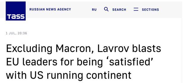 俄塔社:拉夫罗夫抨击欧盟领导层对美国领导欧洲大陆感到“满意”,除了马克龙