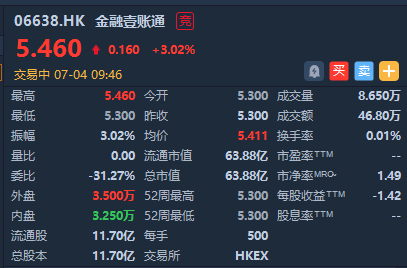 华盛资讯7月4日讯,中国平安旗下金融壹账通 $06638.HK 今日以介绍形式挂牌港股上市,首挂平开,现涨3.02%,报价5.46港元,港股总市值超63亿港元。