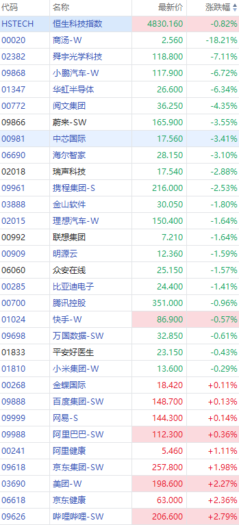 汽车股、芯片股走跌,舜宇光学科技跌超7%,小鹏汽车、华虹半导体跌超6%,蔚来、中芯国际跌超3%。