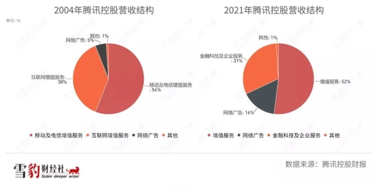 2004年,腾讯发布在港交所上市后的第一份年报。彼时,腾讯营收的双轮驱动是移动及电信增值服务、互联网增值服务。而在腾讯的2021年年报中,网络广告的营收占比从上市之初的5%提升到了16%,各项增值服务被整合后,占比从17年前的94%收缩至52%,金融科技及企业服务收入占比则达到了31%。