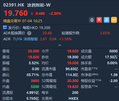 华盛资讯7月4日讯,物联网云开发平台涂鸦智能 $02391.HK 暗盘高开1.66%,现涨2.38%,报价19.76港元,最新总市值超114亿港元。该股预计将于明日(7.5)正式港股挂牌上市。