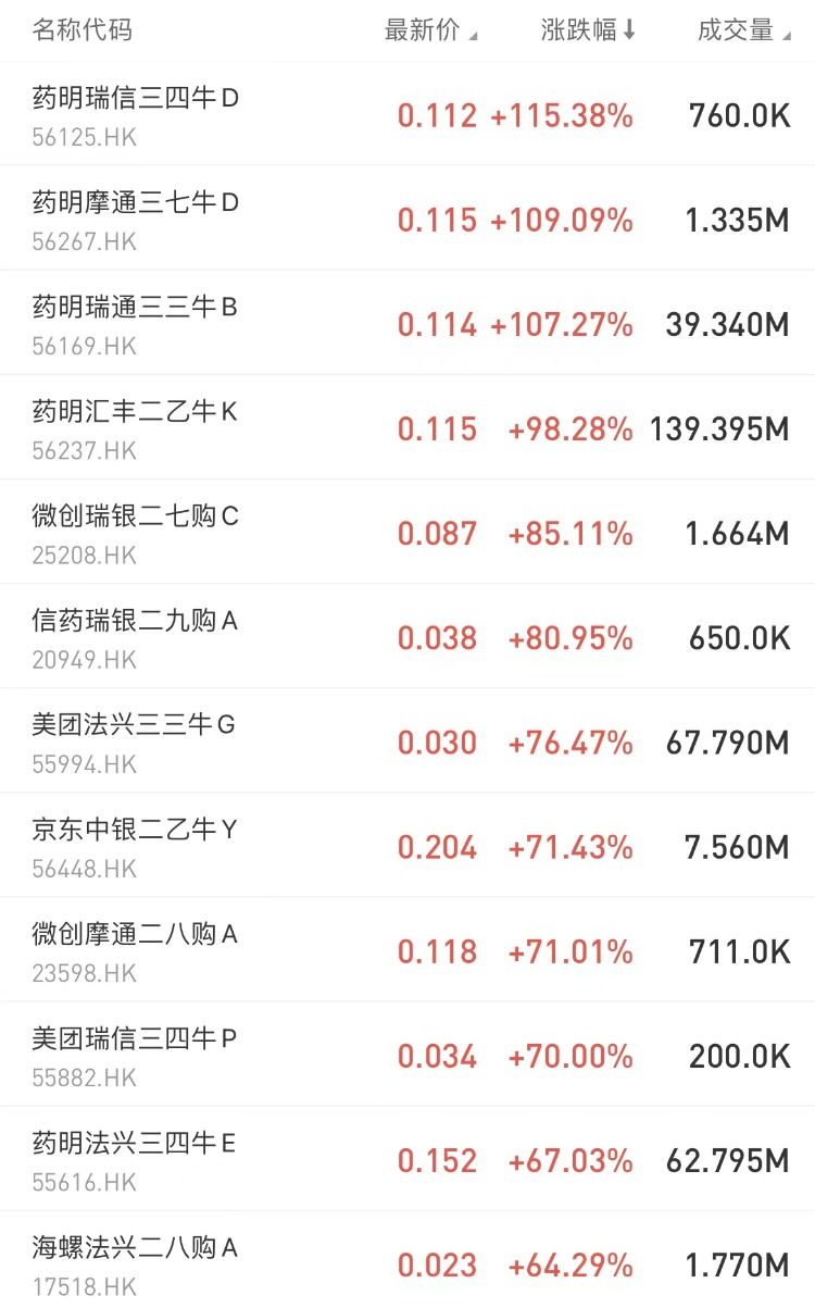 在今日涨幅榜中,居前包括:药明瑞信三四牛D $56125.HK 涨115.38%;微创瑞银二七购C $25208.HK 涨85.11%;信药瑞银二九购A $20949.HK 涨80.95%。