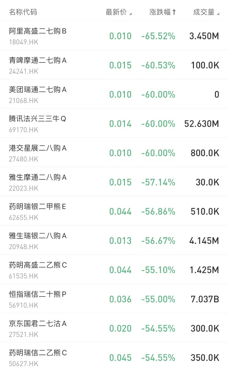 在今日跌幅榜中,阿里高盛二七购B $18049.HK 跌65.52%;青啤摩通二七购A $24241.HK 跌60.53%。
