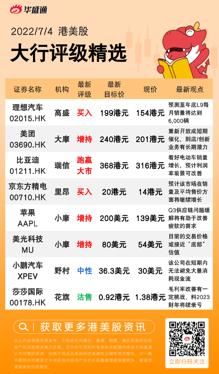 瑞信发表报告指,比亚迪今年6月销量符合预期,达13.4万辆,同比上升163%,且创历史新高。该行相信增长主要由于上海解除封锁,不仅推动部分供应复苏,亦使集团上海的交付中心重新运作,该中心去年贡献集团总销售6%。瑞信估计,比亚迪今年第二季的销售将同样创新高,达35.5万辆,同比增长147%,同时预期集团上季的盈利能力会有持续改善,主因加价令可比售价提高,及平均售价增长。该行重申对比亚迪H股“跑赢大市”评级,目标价368港元。