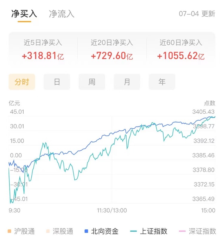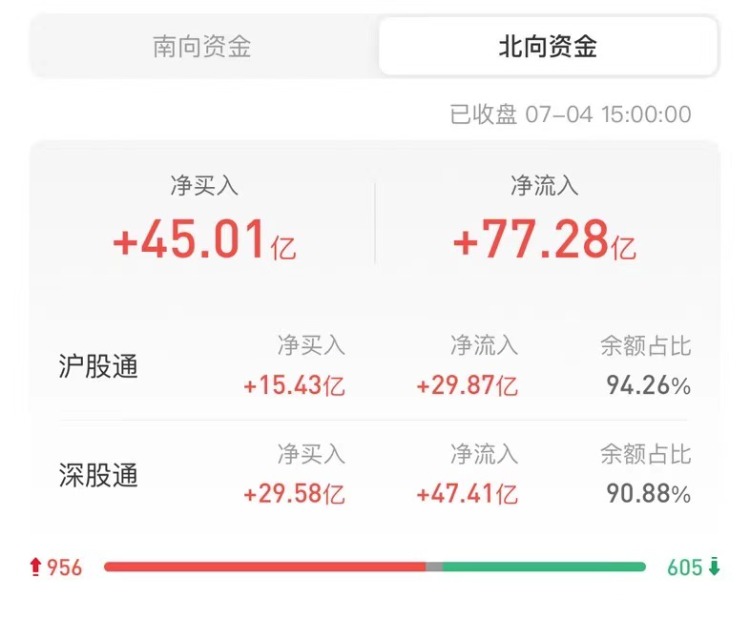 北上资金今日净买入45.01亿元,沪股通净买入15.43亿元,深股通净买入29.58亿元。上一交易日净卖出16.83亿元。