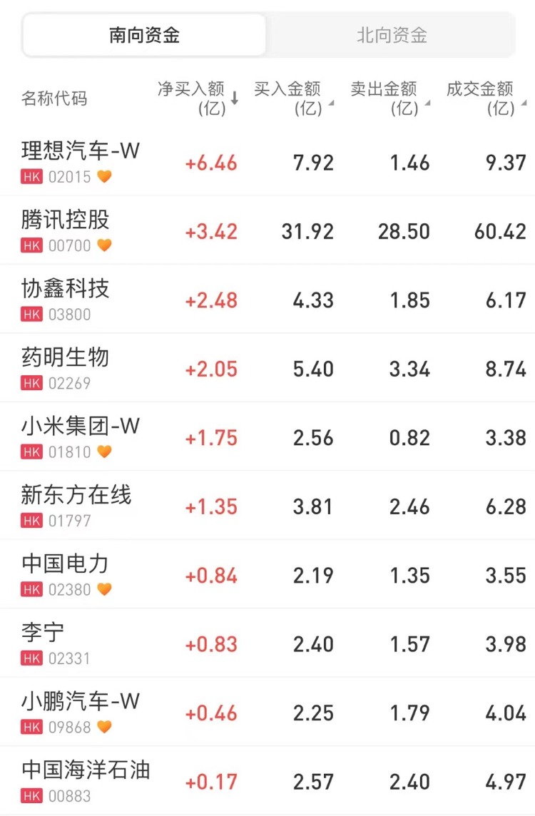 南下资金净买入理想汽车6.46亿港元,为今日买入之最。北水增持腾讯3.42亿港元。此外,南下资金净买入协鑫科技2.48亿港元,药明生物、小米集团-W也获增持。