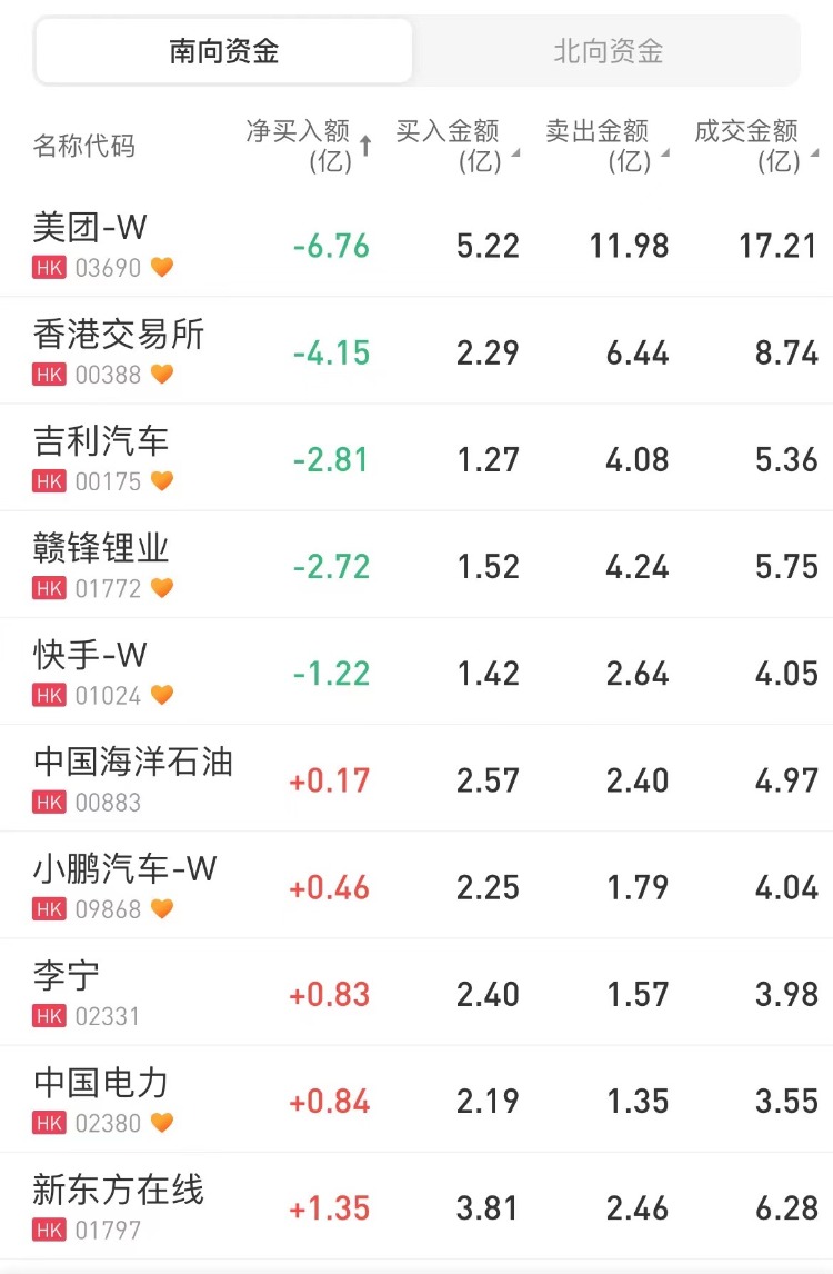 南下资金净卖出美团-W6.76亿港元,为今日卖出之最,净卖出香港交易所4.15亿港元。