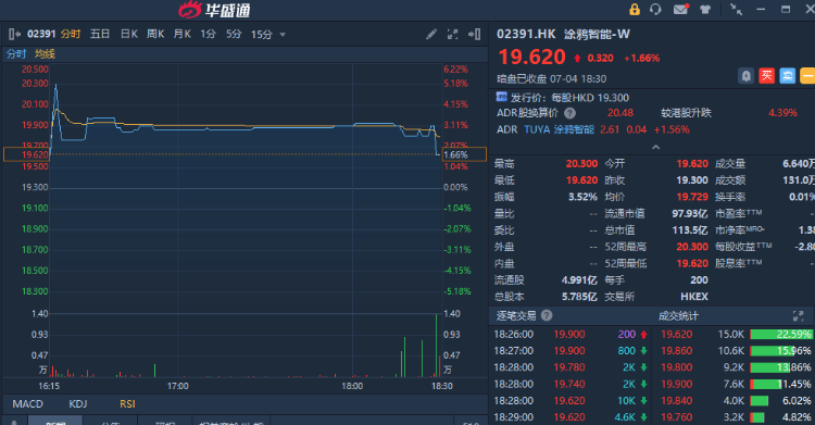 华盛资讯7月4日讯,物联网云开发平台涂鸦智能 $02391.HK 暗盘收涨1.66%,最新总市值超113亿港元。该股预计将于明日(7.5)正式港股挂牌上市。