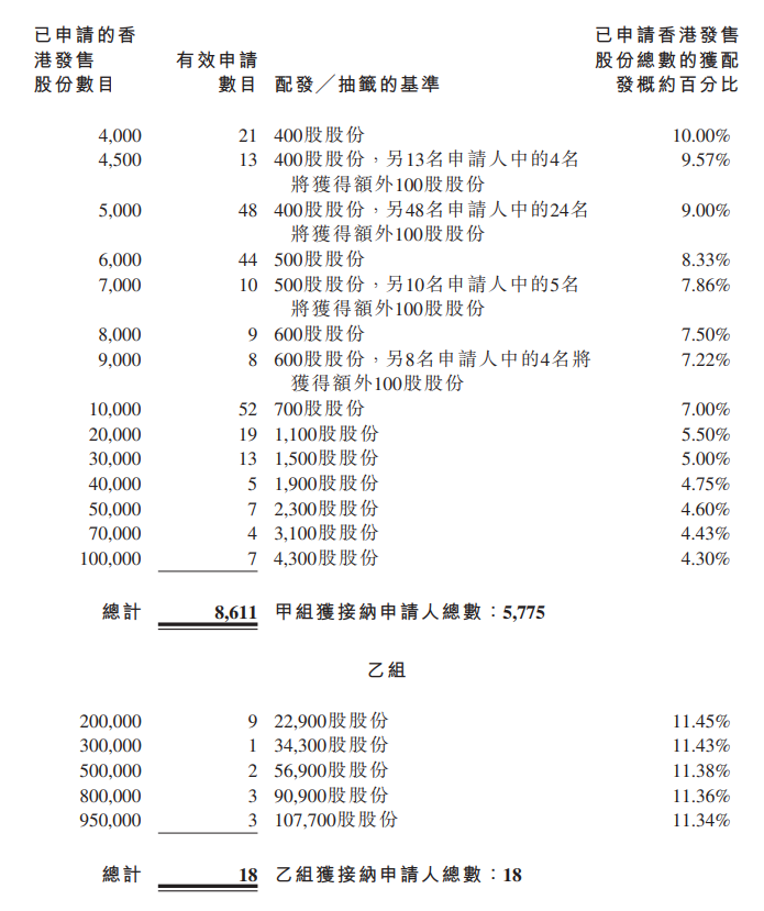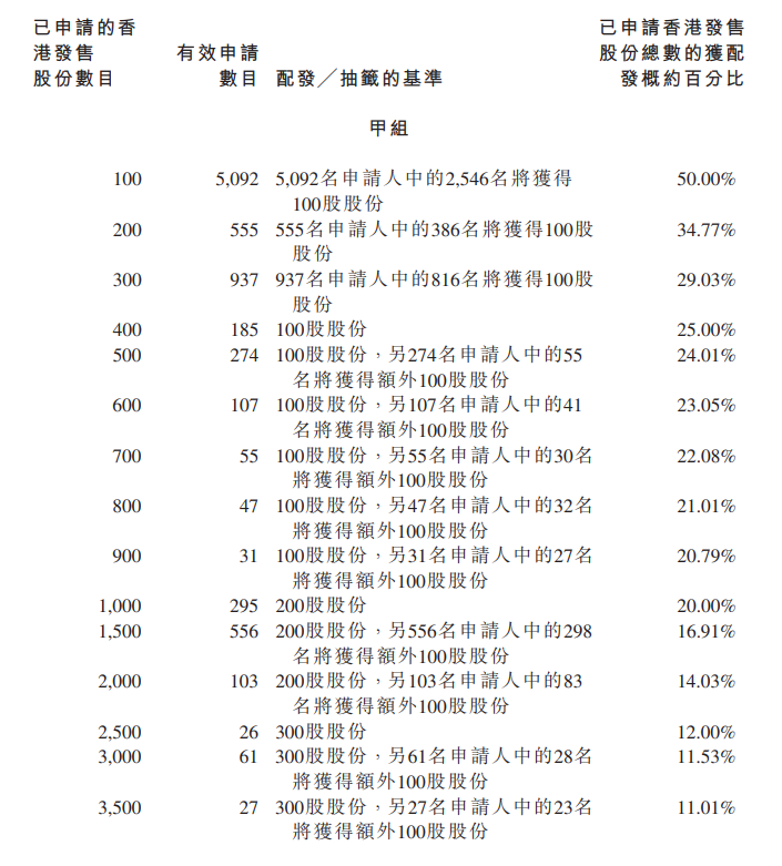 香港发售股份已获超额认购,公司已接获合共8629份根据香港公开发售认购合共14,988,500股香港发售股份的有效申请,相当于香港公开发售项下初步可供认购的数目1,900,000股香港发售股份约7.89倍。