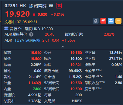 华盛资讯7月5日讯,物联网云开发平台涂鸦智能-W $02391.HK 首挂高开1.35%,现涨3.21%,一手账面浮盈120港元,当前成交额276万港元,最新总市值超114亿港元,昨日暗盘收涨1.66%。