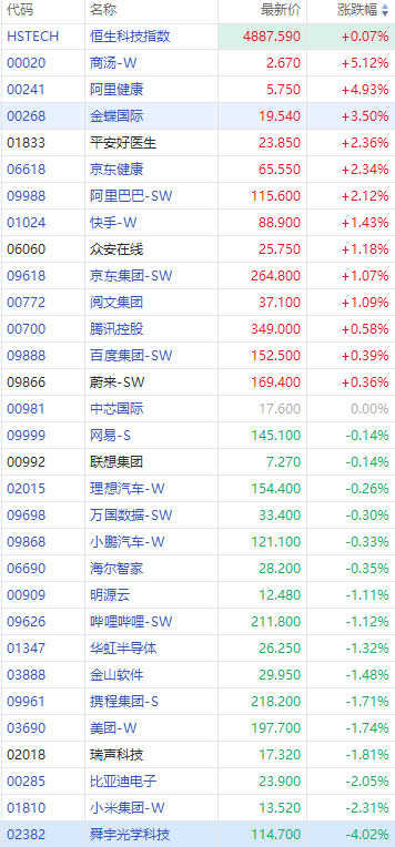 舜宇光学科技跌超4%,机构称其短期业绩下修压力仍存,2023年有望恢复快速增长;小米集团-W、比亚迪电子跌超2%,携程集团-S、美团-W跌超1%。