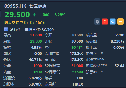 华盛资讯7月5日讯,互联网医疗平台智云健康 $09955.HK 暗盘平开,现跌3.28%,最新总市值超173亿港元。该股预计将于明日(7.6)正式港股挂牌上市。