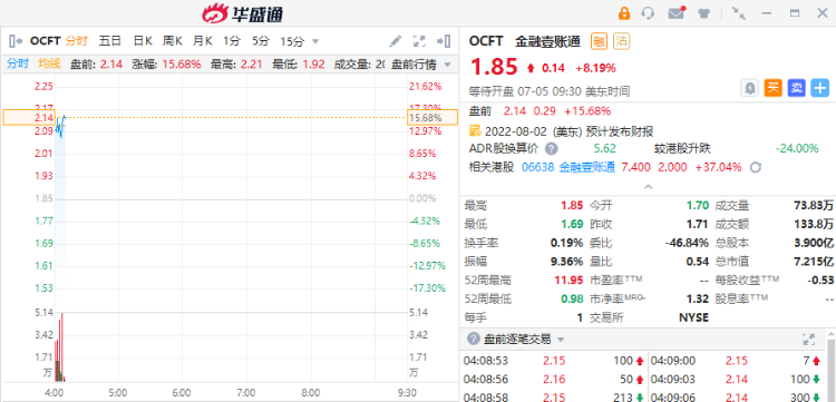 华盛资讯7月5日消息,美股盘前,金融壹账通盘前一度涨近16%,截至发稿,该股涨超14%;今日港股盘中,该股回港上市次日尾盘盘中一度涨超42%,最高触及7.7港元创新高。