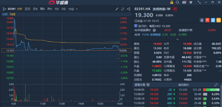 华盛资讯7月5日讯,物联网云开发平台涂鸦智能-W $02391.HK 首挂高开1.35%,尾盘平收,全日成交额788.3万港元,最新总市值超111亿港元。