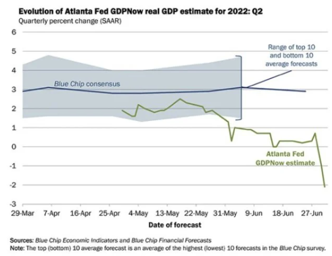 亚特兰大联储GDPNow预测模型上周五最新公布的数据显示,该模型预计美国二季度GDP将萎缩2.1%,较前一日的预测值-1%大幅下修。此前,美国一季度GDP增速为-1.6%,从传统的衰退定义来讲,若二季度继续萎缩则将意味着美国经济陷入技术性衰退。