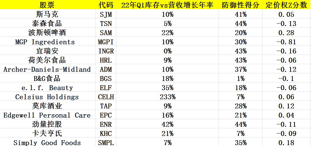 根据美国银行对客户流量的调查,标普500指数处于熊市区域,投资者已转向防御类股。瑞银策略师Keith Parker在报告中写道:“我们认为标普1500必需消费品指数中的个股可能不像人们普遍认为的那样具有防御性。我们挑选出那些库存减去销售增长率>0%的股票,以及基于我们专有框架的防御性得分位于后50分位的股票。”