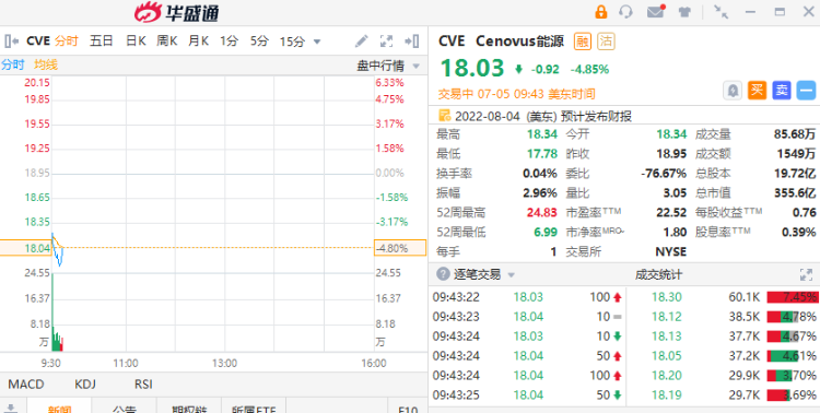 华盛资讯7月5日讯,布伦特原油跌破107美元/桶,为5月19日以来首次,日内大跌6.1%,WTI原油日内重挫7%,现报102.76美元/桶。美股盘初,油气股集体走弱,截至发稿,Cenovus能源跌近5%,报18.03美元。