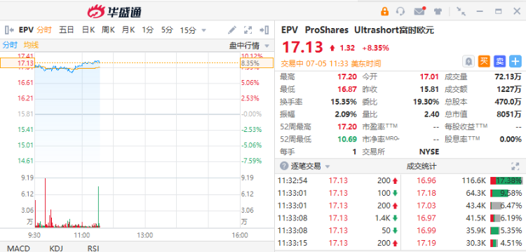欧元兑美元一度下跌1.2%,至1.0298,为2002年12月以来的最低水平,原因是欧洲央行可能放缓加息周期的预期,令市场更加确信欧元兑美元汇率将跌至平价。ETF方面, ProShares Ultrashort富时欧元 $EPV 涨超8%,2倍做空欧元 $EUO 涨超3%。