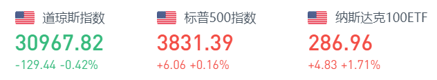 截至7月5日周二收盘,道指跌129.44点,跌幅为0.42%,报30967.82点;纳指涨194.39点,涨幅为1.75%,报11322.24点;标普500指数涨6.06点,涨幅为0.16%,报3831.39点。