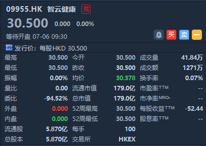 华盛资讯7月6日讯,互联网医疗平台智云健康 $09955.HK 首挂平开,盘前成交额1271万港元,最新总市值超179亿港元,昨日暗盘微跌0.33%。
