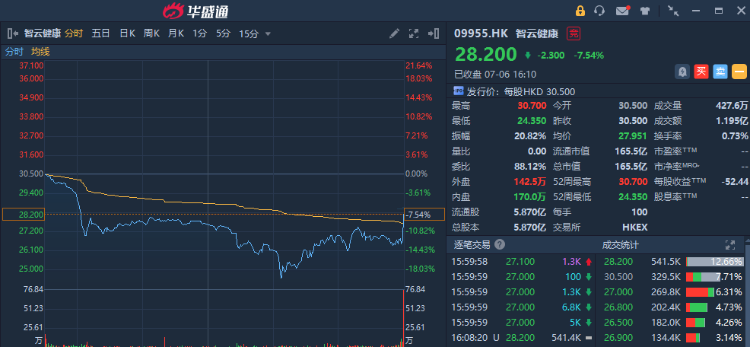 华盛资讯7月6日讯,互联网医疗平台智云健康 $09955.HK 首挂盘中一度跌超19%,尾盘拉升收跌7.54%,一手账面浮亏230港元,全日成交额1.195亿港元,最新总市值超165亿港元。