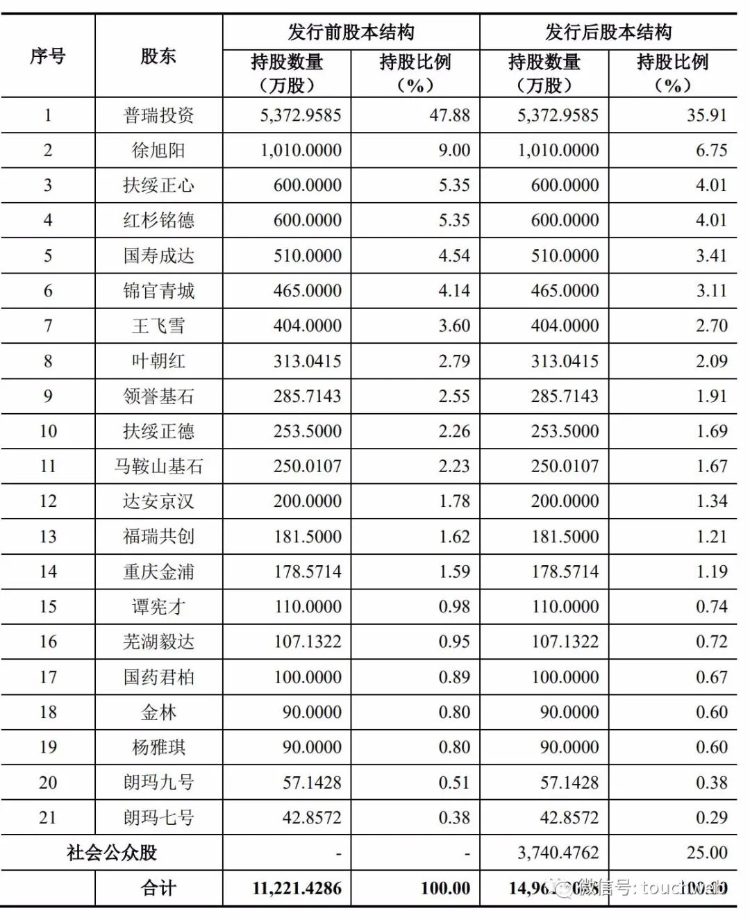 IPO后,普瑞投资持股35.91%,徐旭阳直接持股为6.75%,扶绥正心、红杉铭德分别持股4.01%,国寿成达持股为3.41%,锦官青城持股为3.11%。