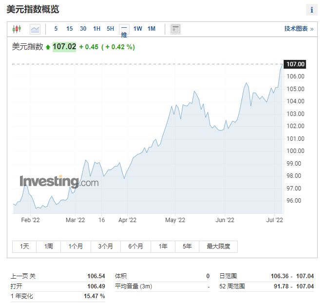美元指数DXY站上107,续创2002年12月以来新高。欧元兑美元EUR/USD跌破1.02,续创2002年12月以来新低。市场越来越猜测美元可能很快会达到与欧元平价的水平。衡量美元兑一篮子主要货币汇率的彭博美元指数上涨了1.2%,有望创下2020年6月以来的最大单日涨幅。
