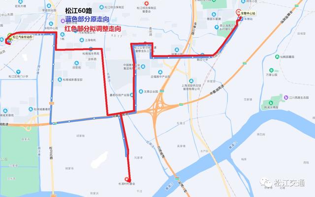 拟调整后线路走向:自车墩中心站起经车峰路、泖亭路、香闵路、香亭路、香泾路、闵塔公路、华长路、闵塔公路、欣浪路、香亭路、松卫北路、北松公路至松江汽车东站。