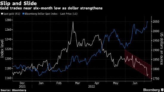黄金跌至逾9个月低点,在衰退担忧日盛而美联储继续加息之际,投资者把美元当成避险资产。