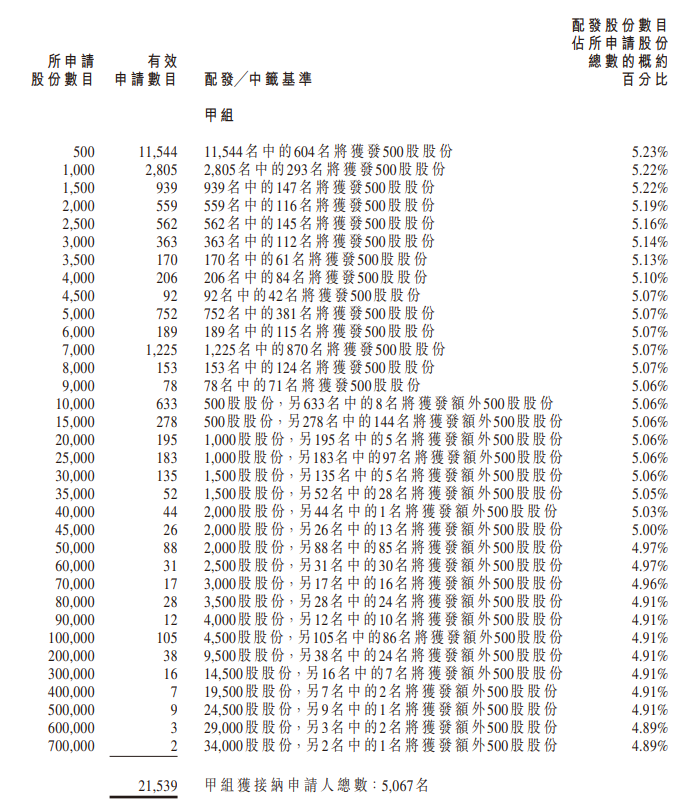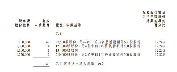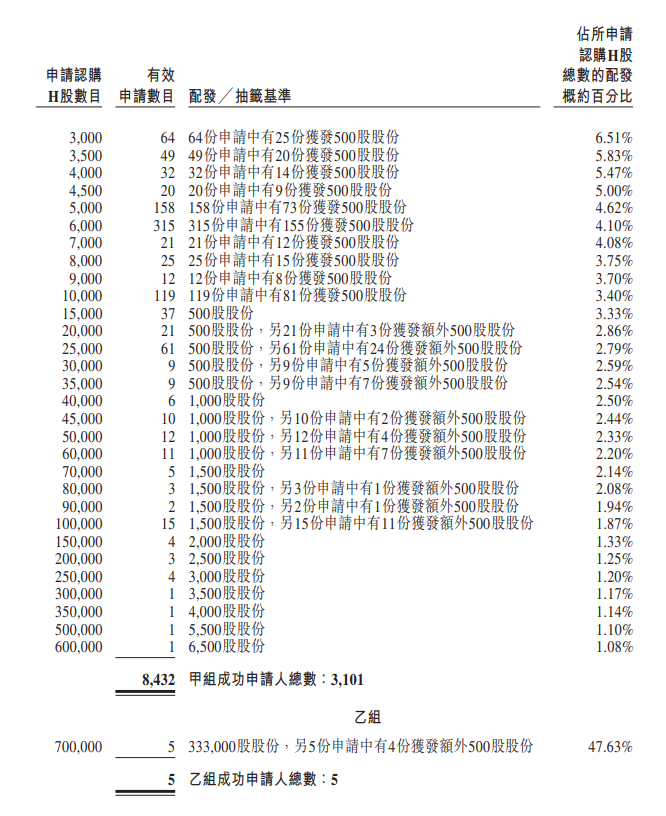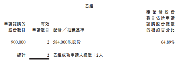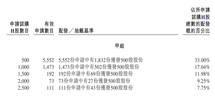香港发售股份已获超额认购,公司已接获合共21,588份根据香港公开发售认购合共144,910,500股香港发售股份的有效申请,相当于香港公开发售项下初步可供认购的数目3,440,000股香港发售股份约42.13倍。