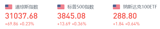 截至7月6日周三收盘,道指涨69.86点,涨幅为0.23%,报31037.68点;纳指涨39.61点,涨幅为0.35%,报11361.85点;标普500指数涨13.69点,涨幅为0.36%,报3845.08点。