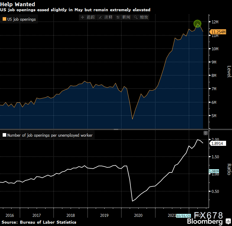 美国5月份职位空缺数小幅下降,但仍接近历史最高水平,表明尽管对经济前景的乐观情绪变得更加不确定,劳动力需求依然坚挺。