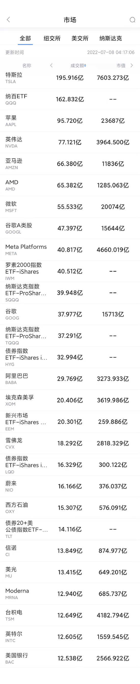 以下为美股当日交易最活跃的20只股票(按成交额):