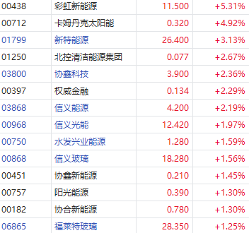 华盛资讯7月8日消息,光伏股普涨,彩虹新能源涨超5%,卡姆丹克太阳能涨超4%,新特能源涨约4%,协鑫科技、信义能源涨超2%。