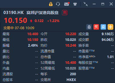 富邦沪深港高股息 $03190.HK 今日正式在港交所上市交易,首挂高开1.92%,现涨1.22%,报价10.15港元。