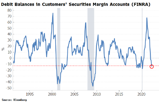 今天的情况如何?根据多项领先指标,经济增长正在放缓,并将继续放缓。这导致了金融压力,在保证金账户借方余额的急剧下降中得到了体现。它们已经跌至先前与经济衰退相关的水平。