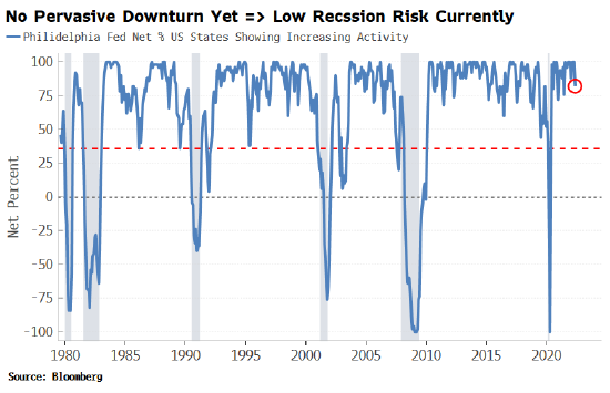 我们正在熊市,市场将继续震荡,容易出现下跌,因此需要更轻的仓位。但更大下跌的可能性不大,除非费城联储等指标预示美国将在几个月内陷入经济衰退。