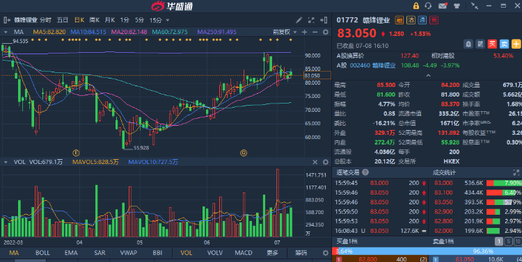 集团未来会在ESG、人材战略、智能自动化、成本控制、风险管理,及市场预测等6个组合内再进一步。为满足锂材料需求日益增加,集团继续在墨西哥、马里及中国青海加快资源布局及建设。于丰城及达洲等地区新建生产基地。并加快项目建设进度,以保持企业成长速度。可于现价83.05元附近吸纳,中长线可见116元,跌穿73元止蚀。