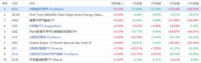 能源ETF周涨幅榜方面,本周涨幅第一的是2倍做多天然气-ProShares $BOIL ,其周涨9.53%。天然气方面,NYMEX 8月天然气期货本周累涨5.31%,逆转三周连跌势头。ICE英国天然气期货本周累涨6.05%,连涨两周;TTF基准荷兰天然气期货本周累涨18.56%,连涨四周且连续2周涨超10%。