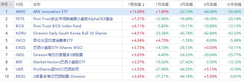 区域ETF方面,本周木头姐管理的旗舰基金ARK Innovation ETF $ARKK 以13.68%的涨幅领跑周榜;其次是First Trust发达市场除美国小盘股AlphaDEX基金 $FDTS ,周涨7.21%。其余多为做多新兴市场股市类ETF。