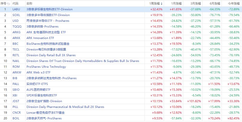 本周ETF涨幅榜涨幅居前的主要为做多科技股类以及做多半导体类ETF,涨幅第一的是3倍做多标普生物科技ETF-Direxion $LABU ,其周涨32.43%;其次是3倍做多半导体指数ETF-Direxion $SOXL ,其周涨19.91%。