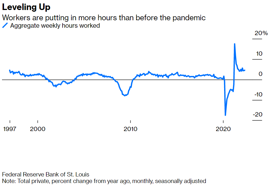 一般来说,人们工作的时间越长,他们的经济产出就越高,而目前,总工作时长的增长仍旧强劲。